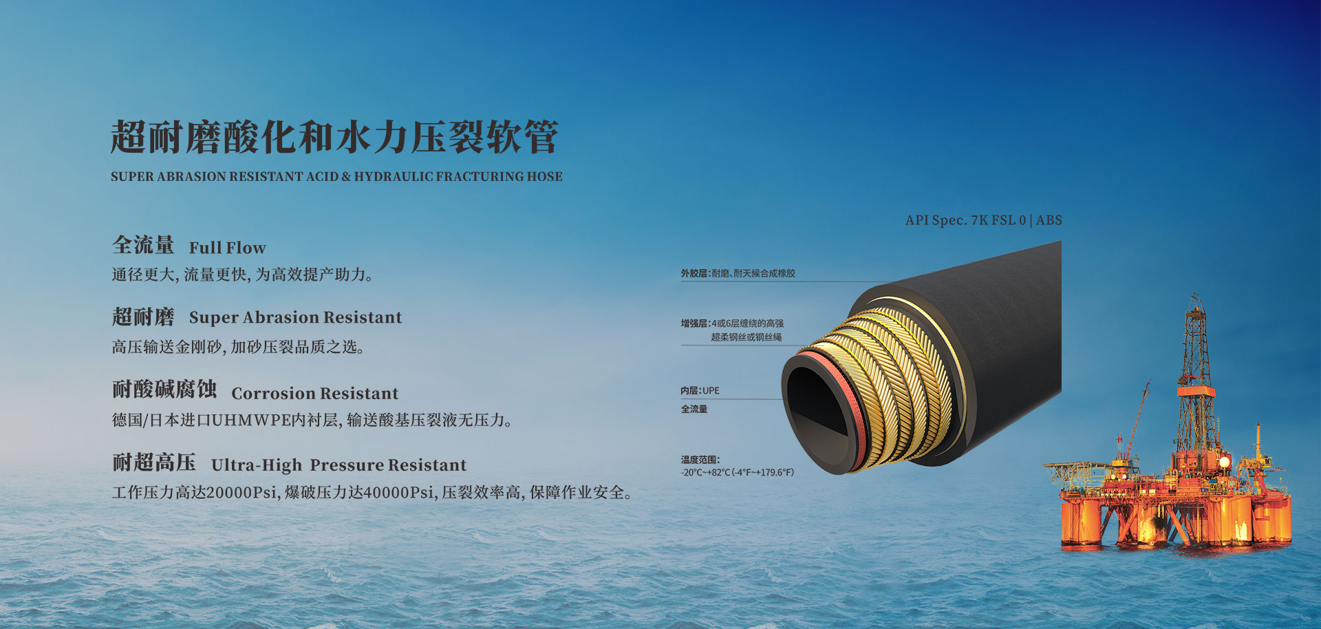 自主研發完井作業中的酸化壓裂、加砂壓裂、水力壓裂管線,在高壓下輸送水基、油基、泡沫、酸基等壓裂液